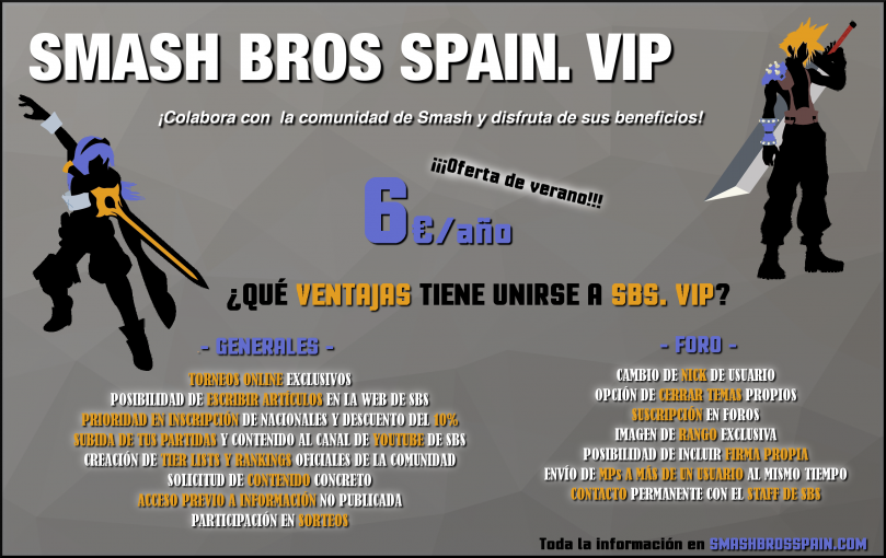 Con la llegada del verano hemos decidido aportar un grado de frescura de manera completa a la experiencia de Usuarios Premium de la que Smash Bros Spain disponía en el pasado, por lo que ahora Smash Bros Spain tiene el placer de presentaros: SBSVip que llega con muchas más novedades para mejorar la calidad y la experiencia de los usuarios tanto en el foro como fuera de él, y sobre todo también abierta a las mejoras que se le ocurran a los mismos. Nuestro objetivo es crear un lugar especial para que todos los usuarios comprometidos con la comunidad lo disfruten, nuestro trabajo está centrado en mejorar su experiencia en Smash Bros Spain.