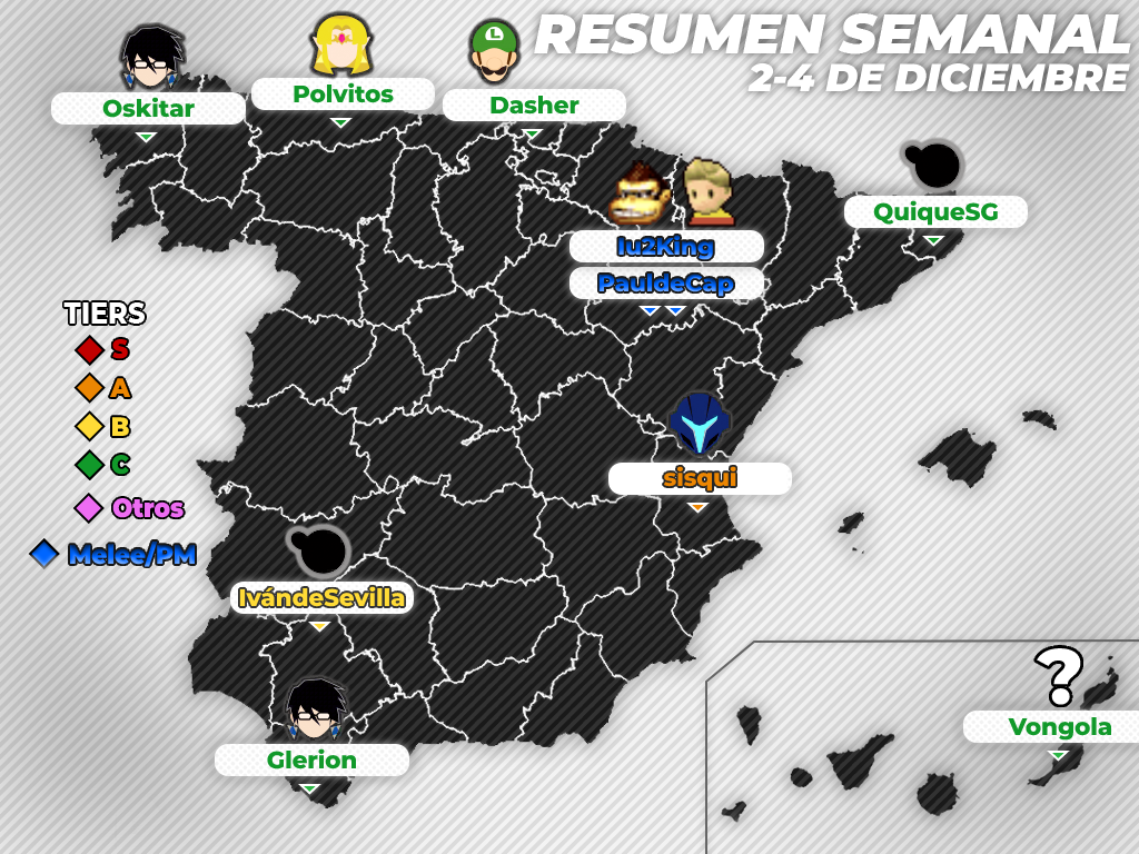 En esta ocasión se cubrirán los torneos ocurridos entre el 2 y el 4 de diciembre de 2022. Para mayor comodidad y organización, se ordenarán de mayor a menor importancia según los criterios de clasificación de Smash Bros. Spain que podéis ver aquí. Dentro de cada tier se ordenará según la fecha de realización de singles y según puntuación si ocurrieron el mismo día.